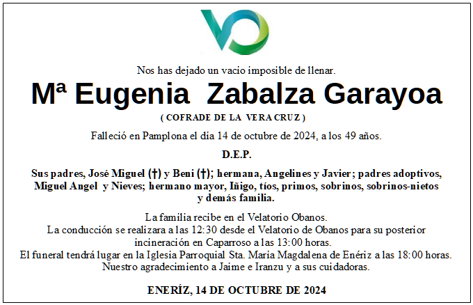 Mª Eugenia Zabalza María Eugenia Zabalza Garayoa 17/51975 – 14/10/2024 envie sus condolencias ACCESO A CONDOLENCIAS RECIBIDAS